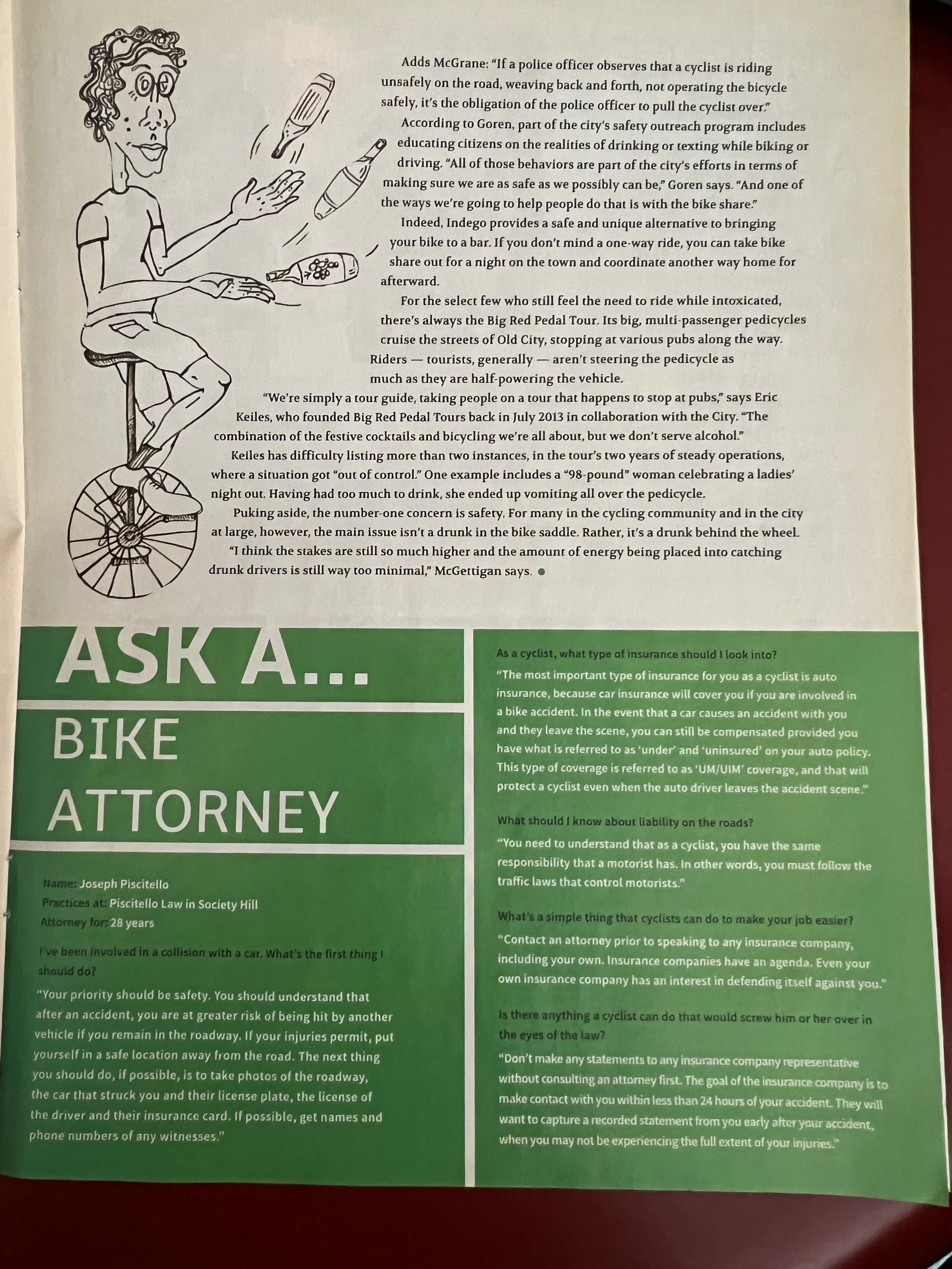 Joe was a featured speaker for an event hosted by Philadelphia’s Spoke Magazine in July 2015: ”Bike vs. Car: What cyclists should do after a collision.” This happy hour and free event took place at W/N W/N Coffee Bar, where cycling commuters and riders came together to discuss how to avoid common bike crashes and what to do after a bike crash.